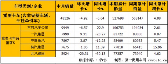 由上表可見(jiàn),環(huán)比上月,銷(xiāo)量前5名的企業(yè)僅有一汽(9.31%)和重汽(3.87%)兩家實(shí)現(xiàn)正增長(zhǎng);與去年同期相比,東風(fēng)汽車(chē)公司以22.90%的增幅成為增長(zhǎng)率最高的企業(yè),并以9949輛的銷(xiāo)量保持重卡月度銷(xiāo)量冠軍。