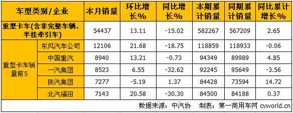 9月份重型卡車(含非完整車輛、半掛牽引車)銷量前5的企業(yè)依次為:東風(fēng)汽車公司(12106輛)、中國重汽(8940輛)、一汽集團(tuán)(8523輛)、陜汽集團(tuán)(7277)和北汽福田(7143輛),5家合計(jì)銷售43989輛,占重型卡車(含非完整車輛、半掛牽引車)9月總銷量54437輛的80.81%。