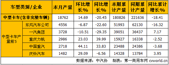 9月份,中型卡車(含非完整車輛)產(chǎn)銷18762輛和20054輛,產(chǎn)銷環(huán)比分別增長14.69%和24.49%,同比分別下降20.45%和13.11%。