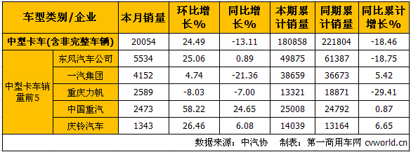 9月份中型卡車(含非完整車輛)銷量前5的企業(yè)依次為:東風(fēng)汽車公司(5534輛)、一汽集團(tuán)(4152輛)、重慶力帆(2589輛)、中國重汽(2473輛)和慶鈴汽車(1343輛),5家合計(jì)銷售16091輛,占中型卡車(含非完整車輛)總銷量20054輛的80.24%。